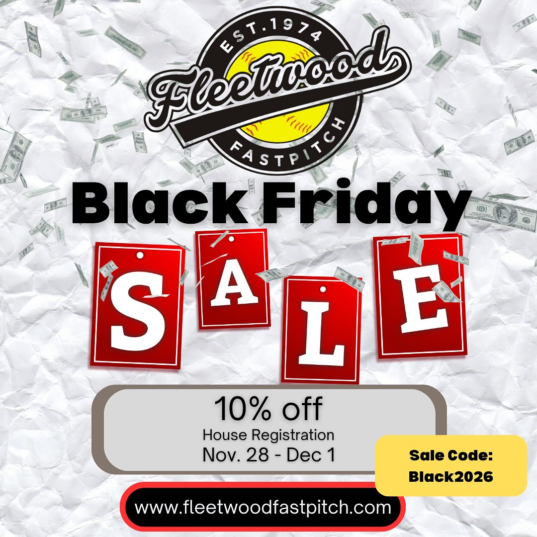 Save 10% on Fleetwood Fastpitch House Registration from Nov. 28-Dec. 1 using code Black2026.